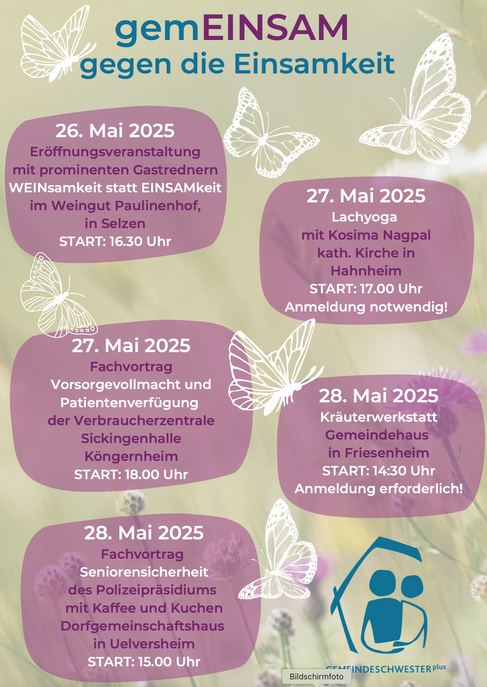 Die Gemeindeschwester+ der Verbandsgemeinde Rhein-Selz hat zusammen mit dem Kinder- und Jugendbüro, dem Seniorenbeirat, dem Inklusionsbeirat, den Rhein-Selz Gefährten, dem Pflegestützpunkt und weiteren Kooperationspartnern viele Angebote für diese Aktionswoche zusammengestellt.
